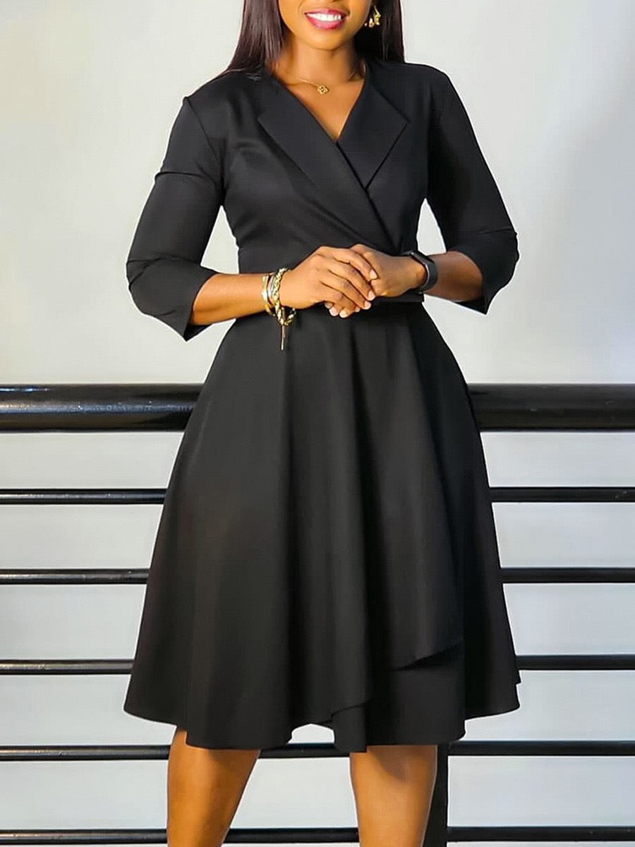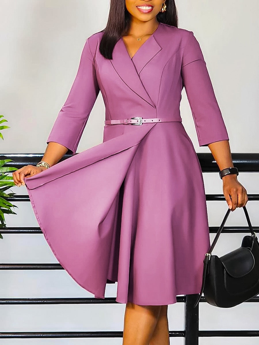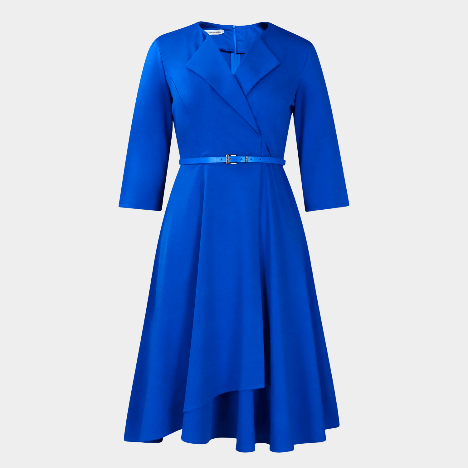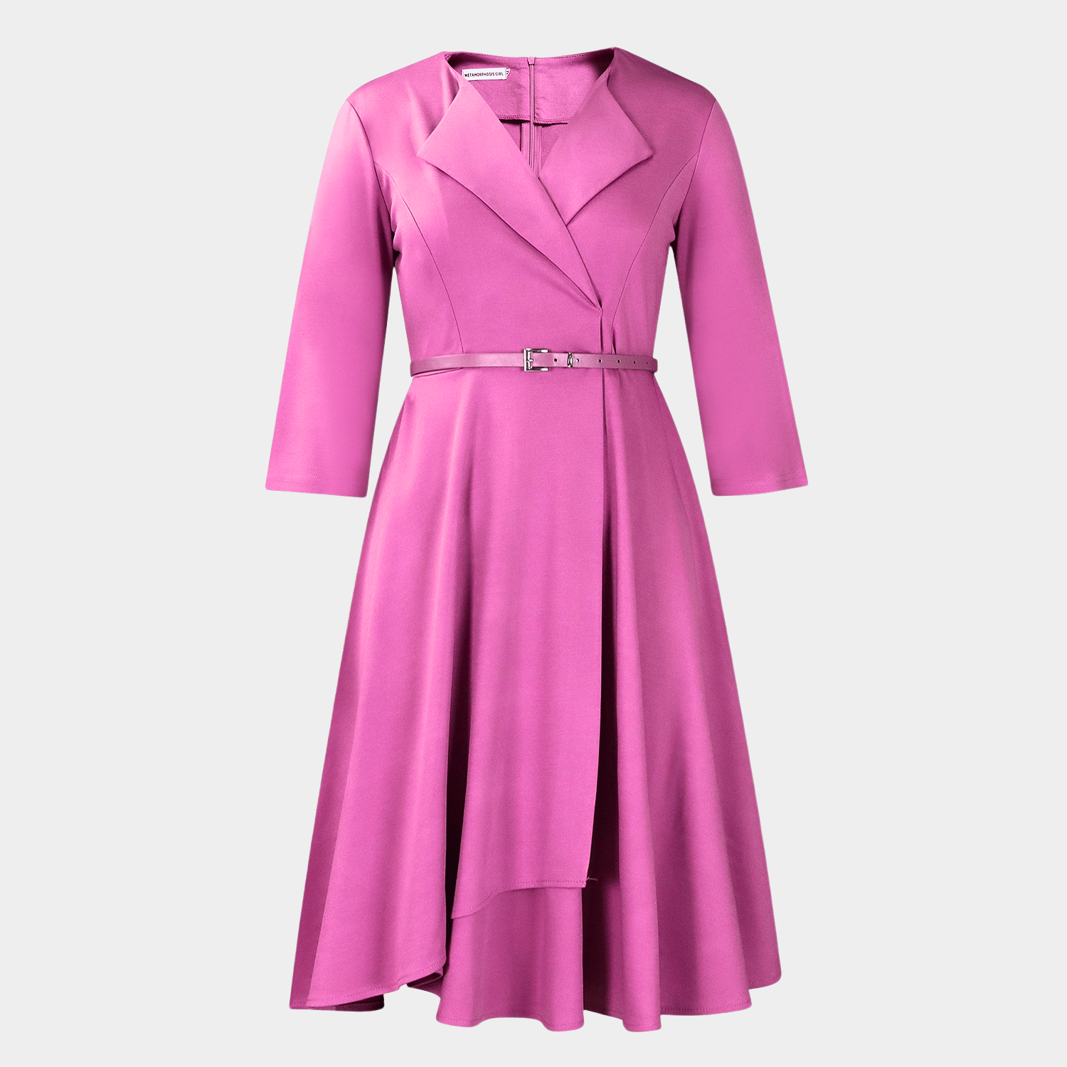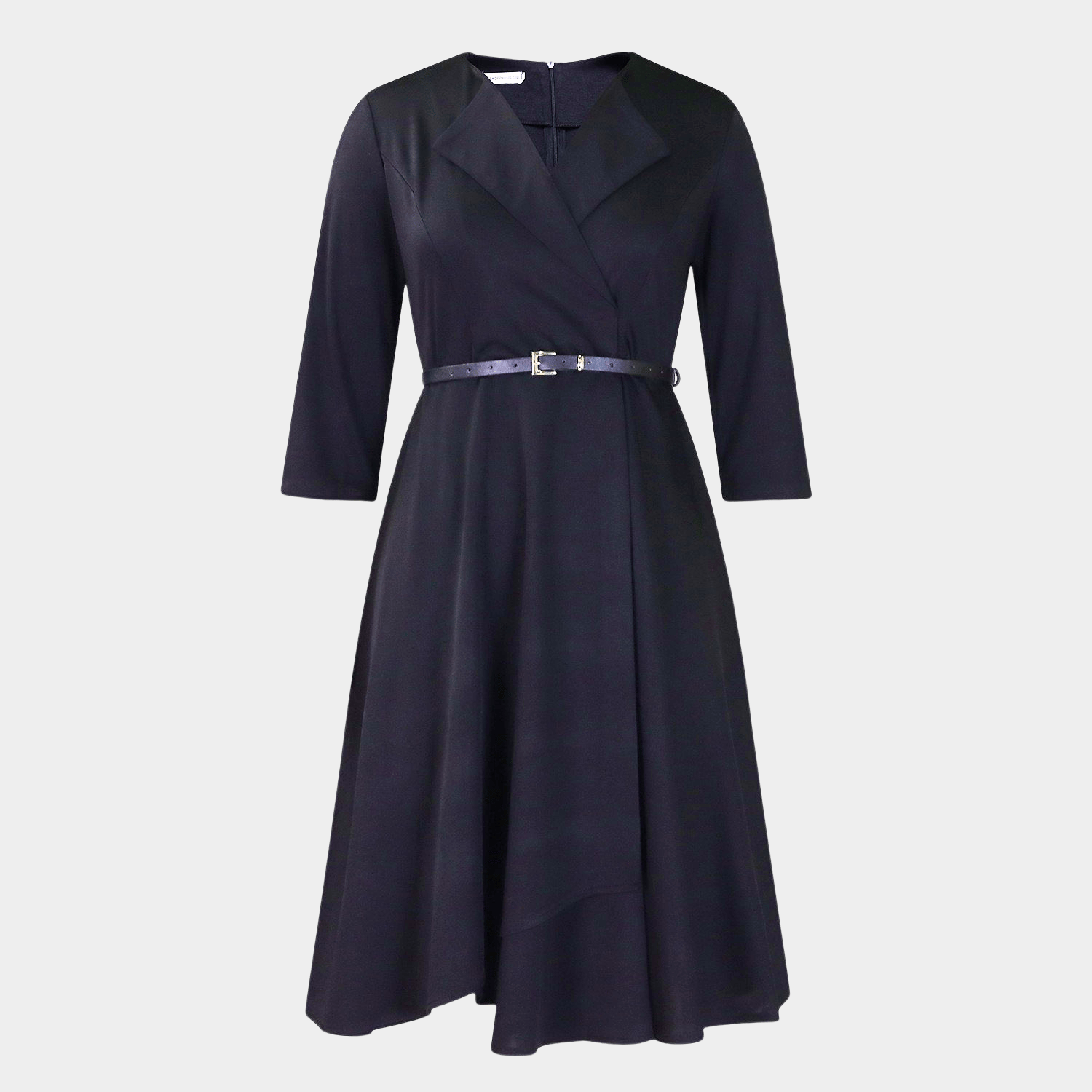 • Design: Tailored bodice, defined waist with belt detail, flared midi skirt, refined neckline, three quarter sleeves.