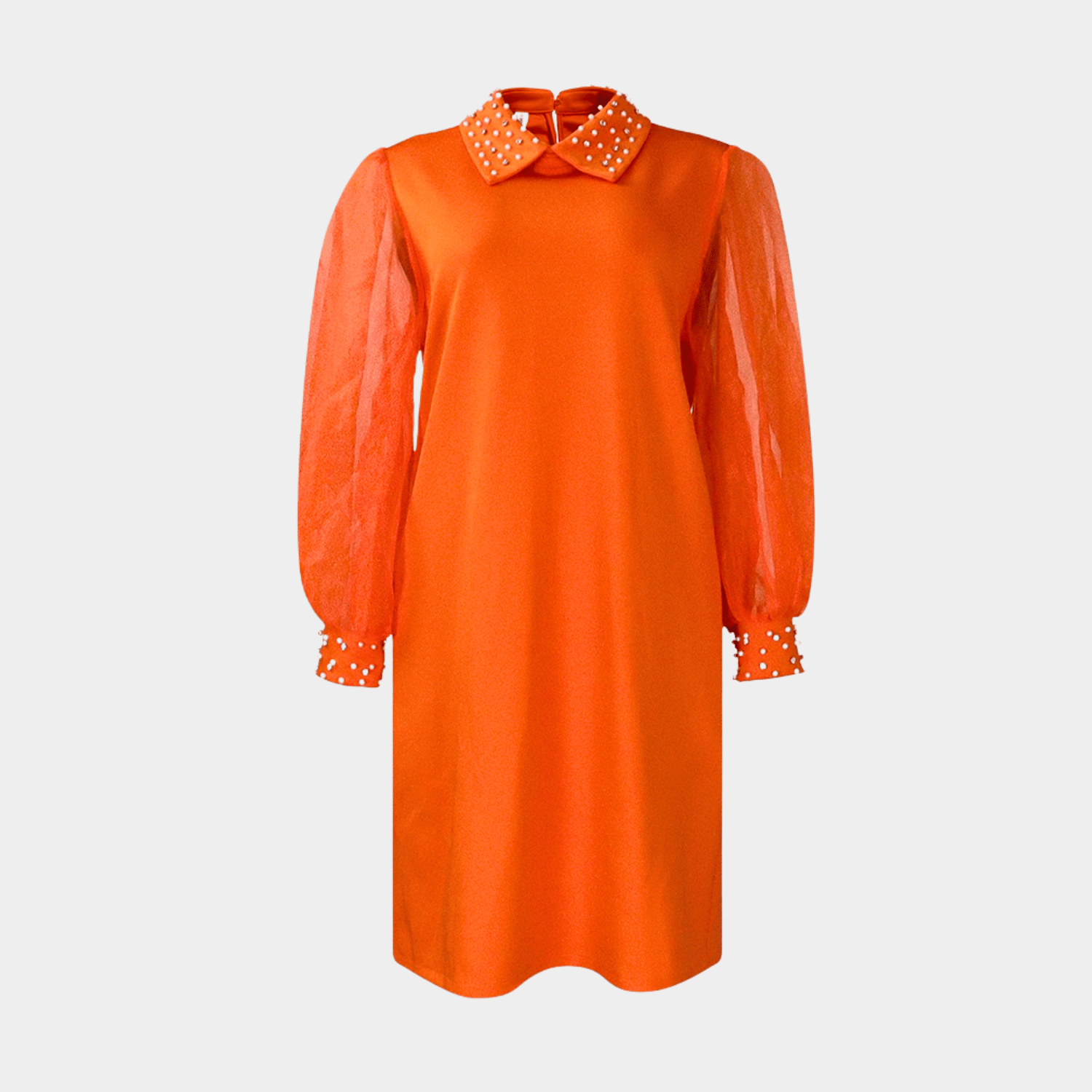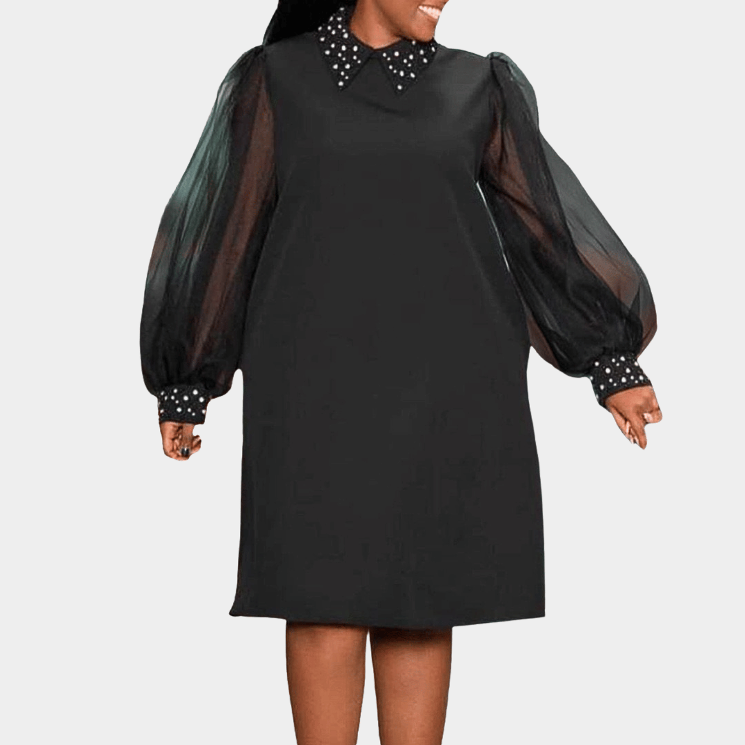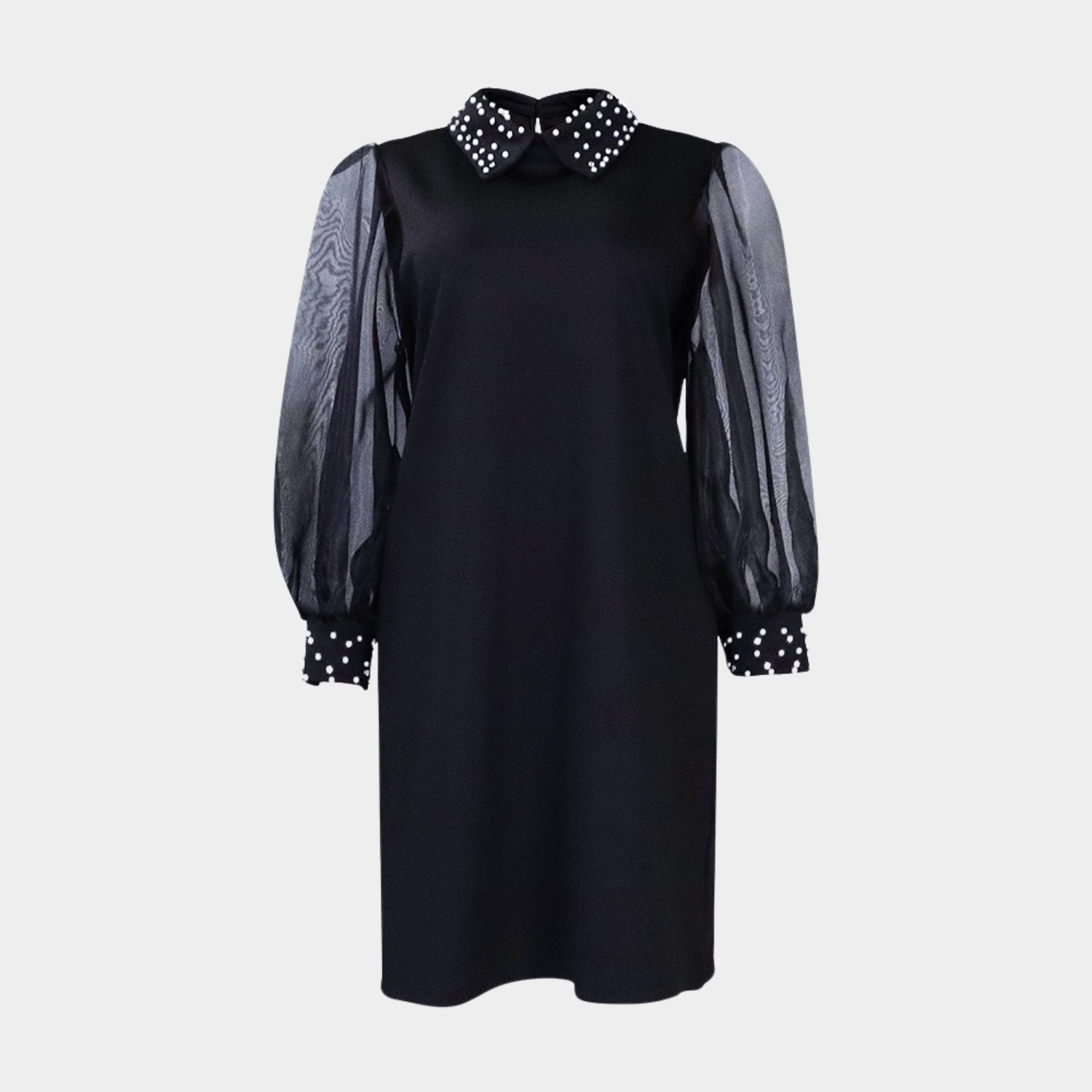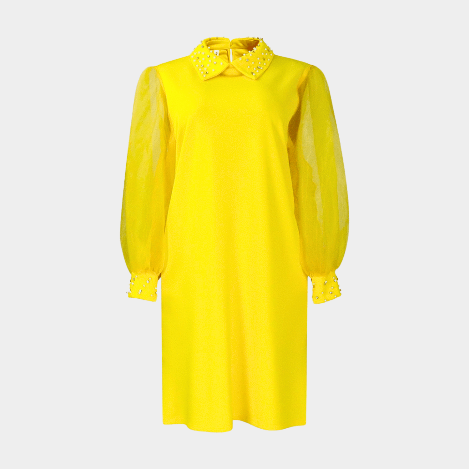 • Design: Relaxed midi silhouette, Beaded embellished collar, sheer volume sleeves, soft structure, fluid lines.
