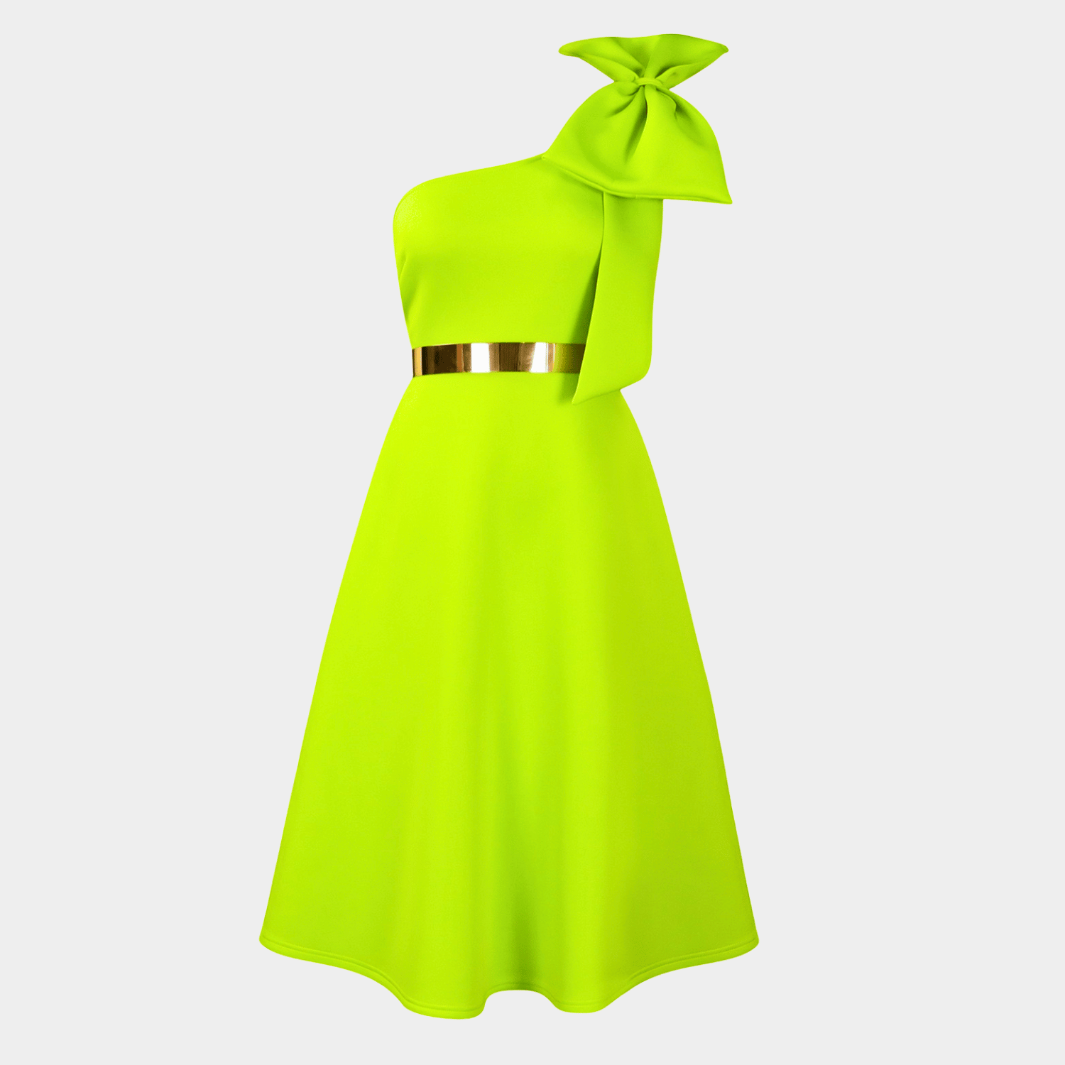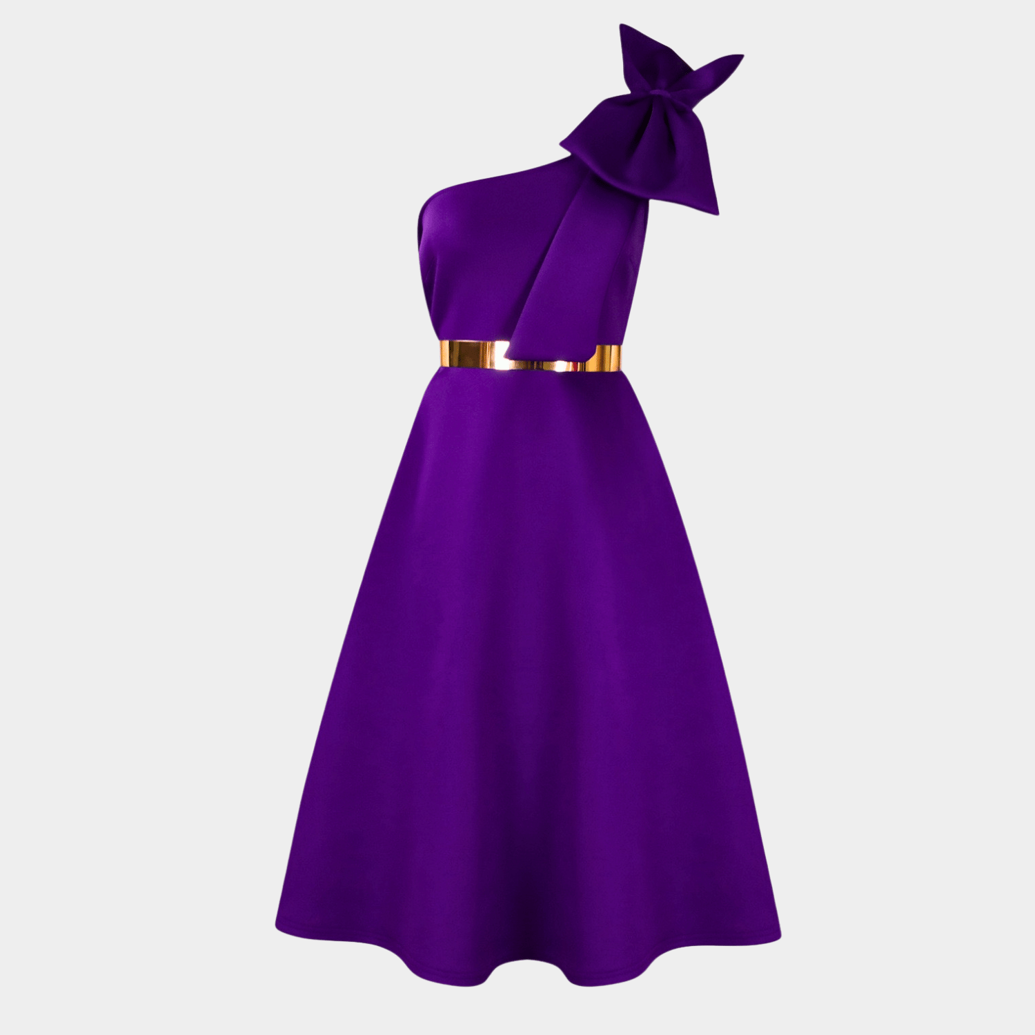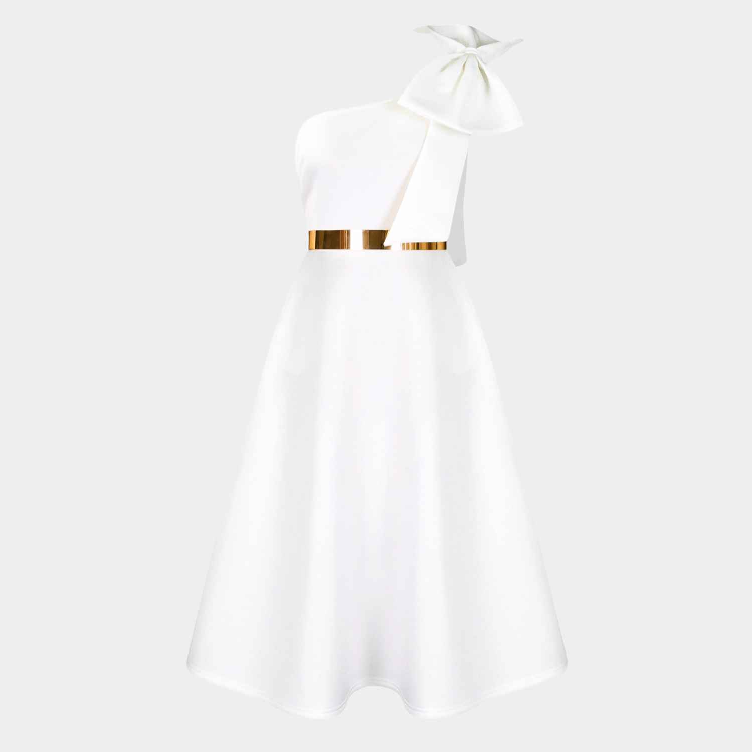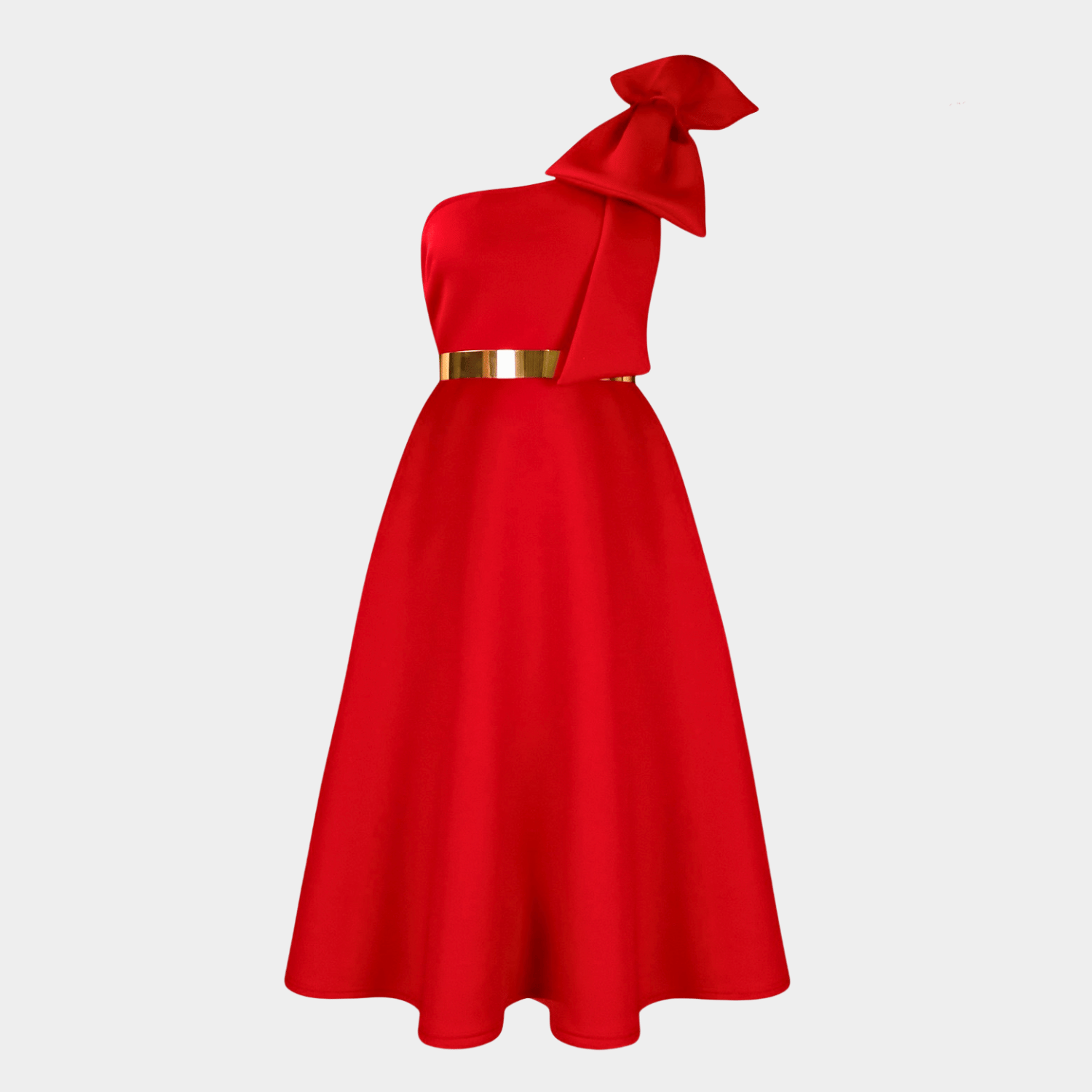 One-Shoulder Sculpted Midi Dress with Gold Waist Belt