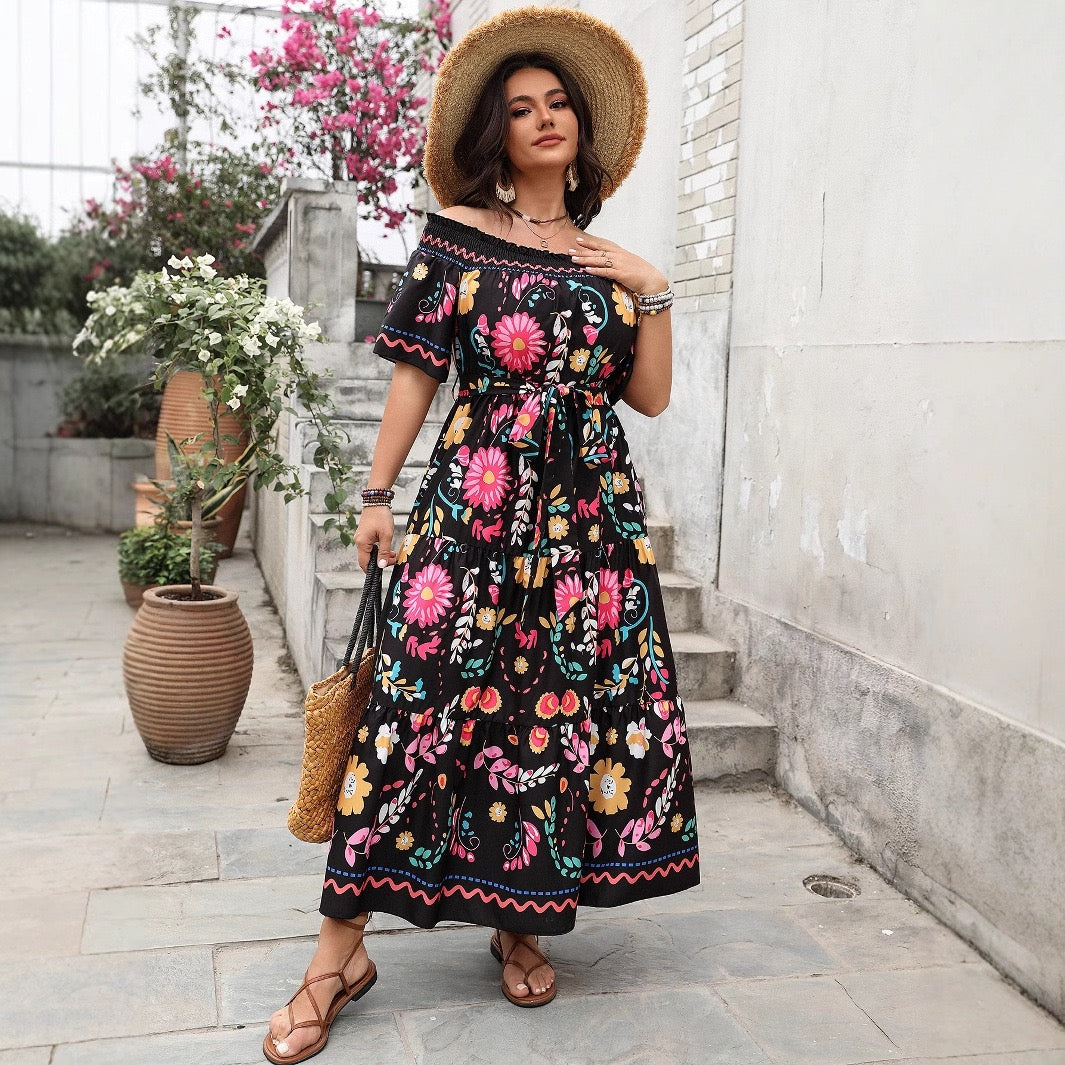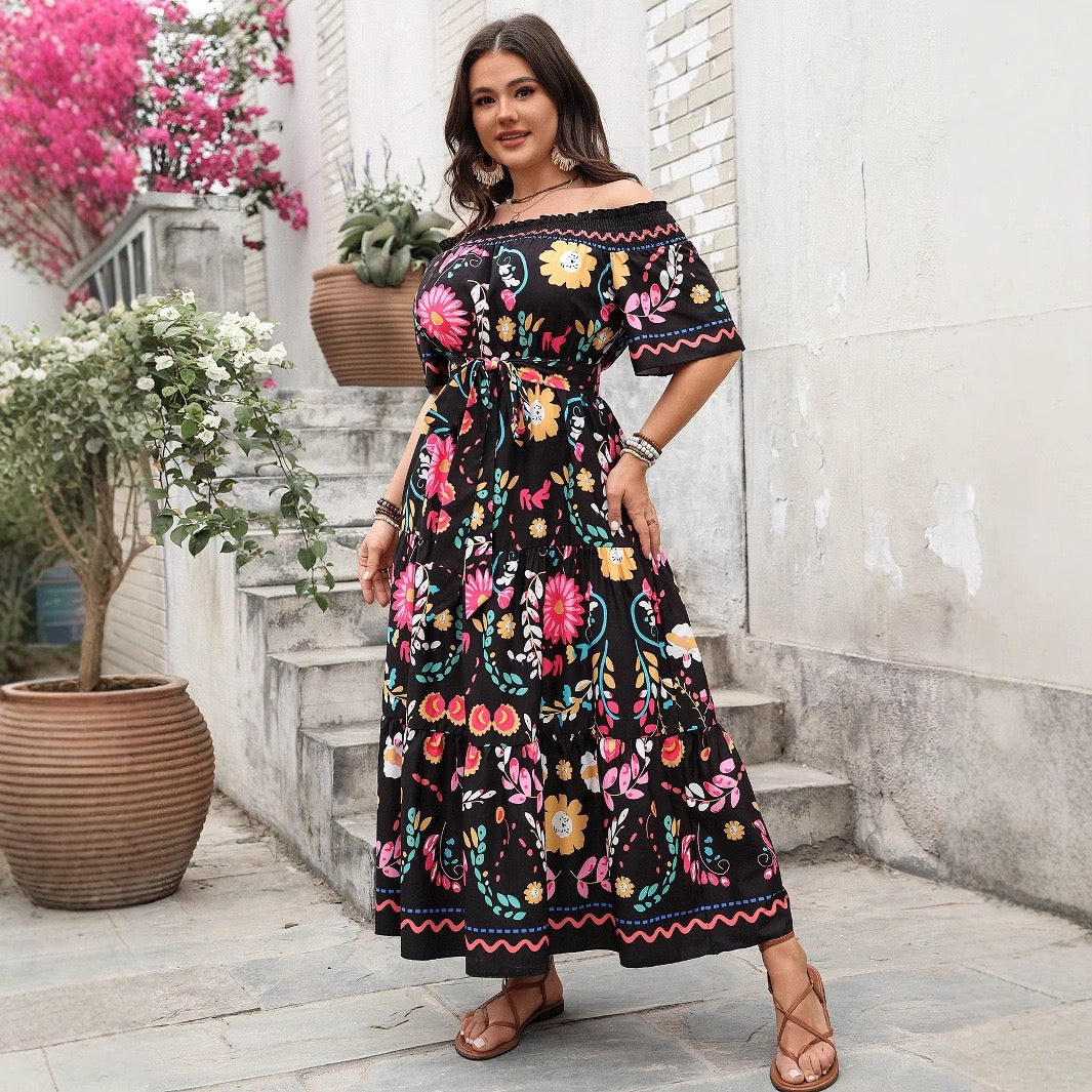 Plus Size Black Floral Off Shoulder Maxi Dress