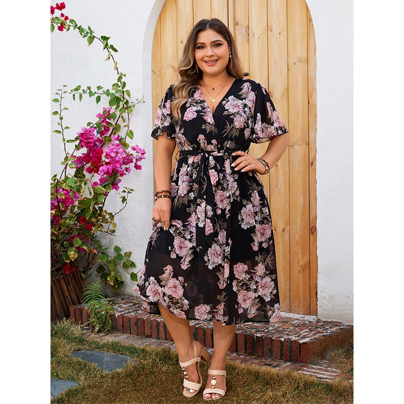 Plus Size Flowing Floral Wrap Dress with Short Sleeves