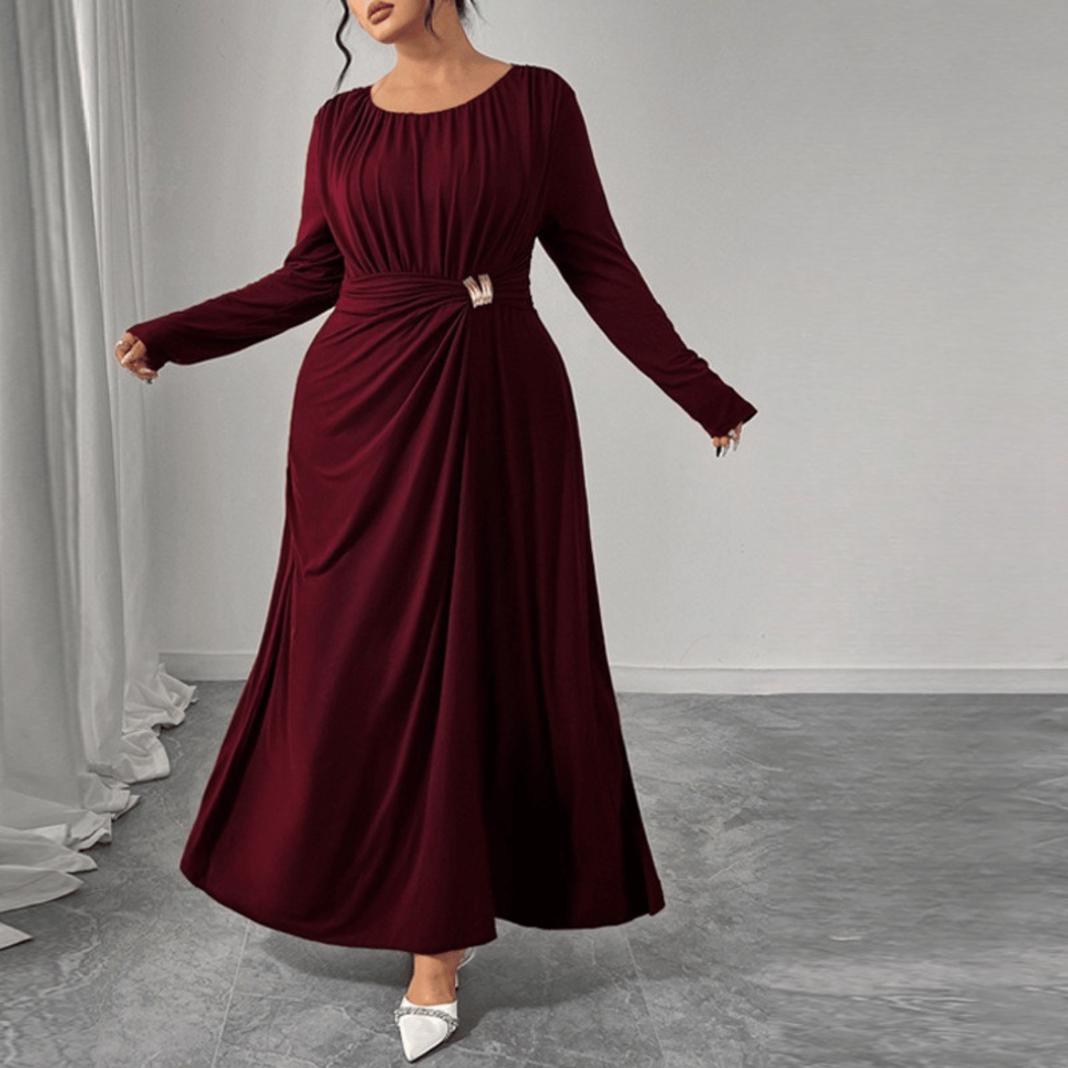 Plus Size Long Dress with Waist Draping and Fluid Fit