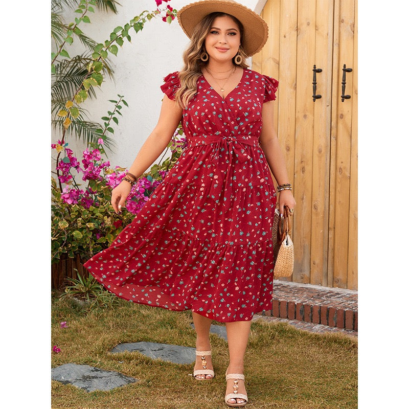 Plus Size Red Casual Floral Midi Dress with Waist Tie