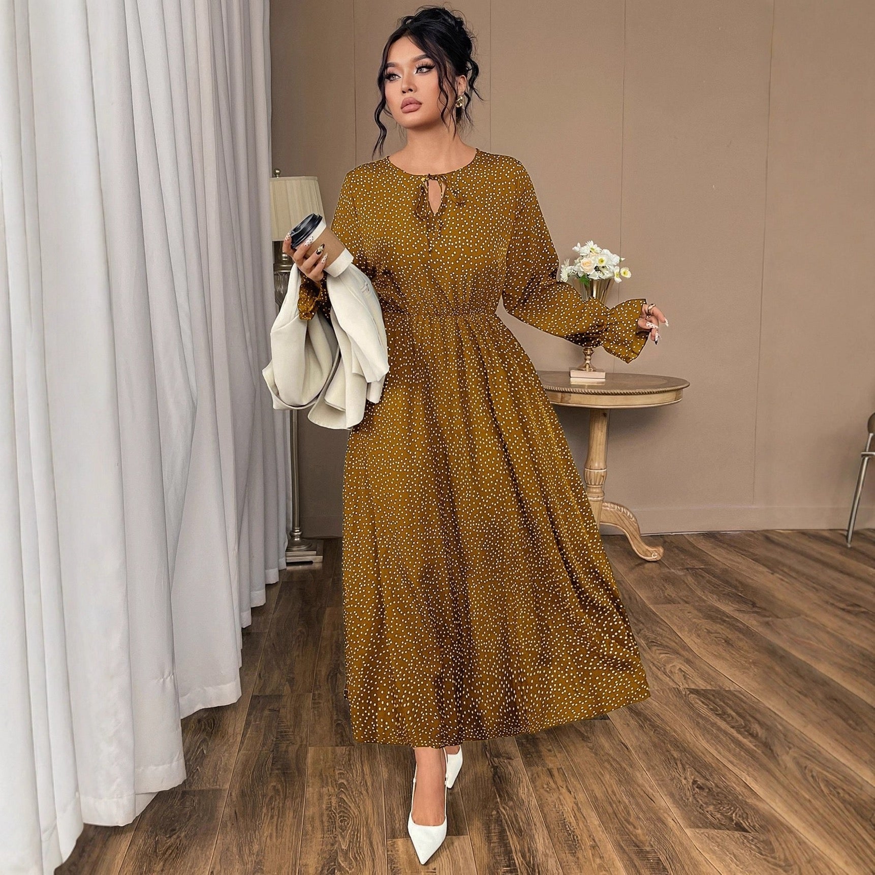 • Design: Adjustable tie neckline, long sleeves, softly gathered waist, flowing maxi silhouette, all over polka dot pattern.