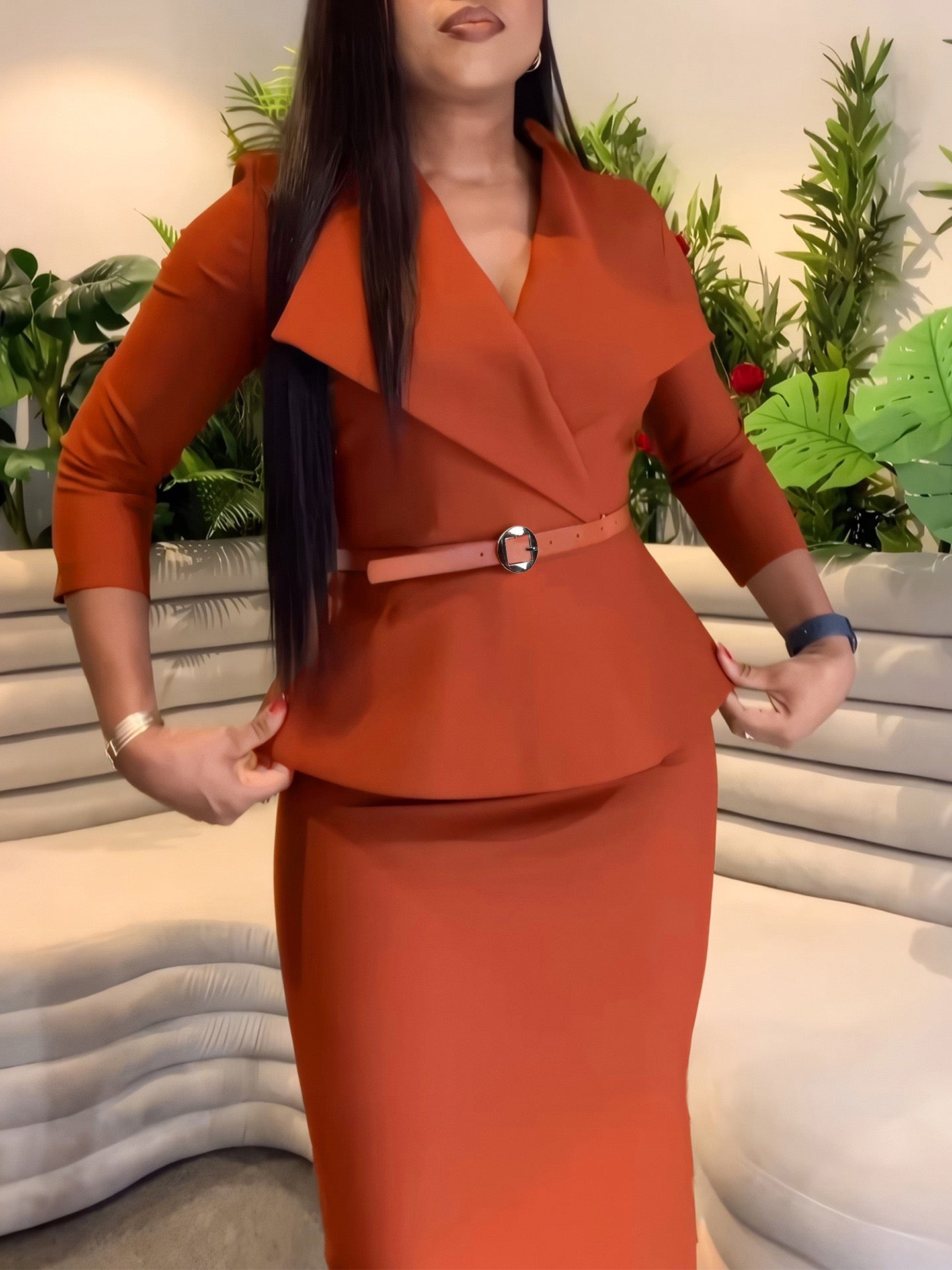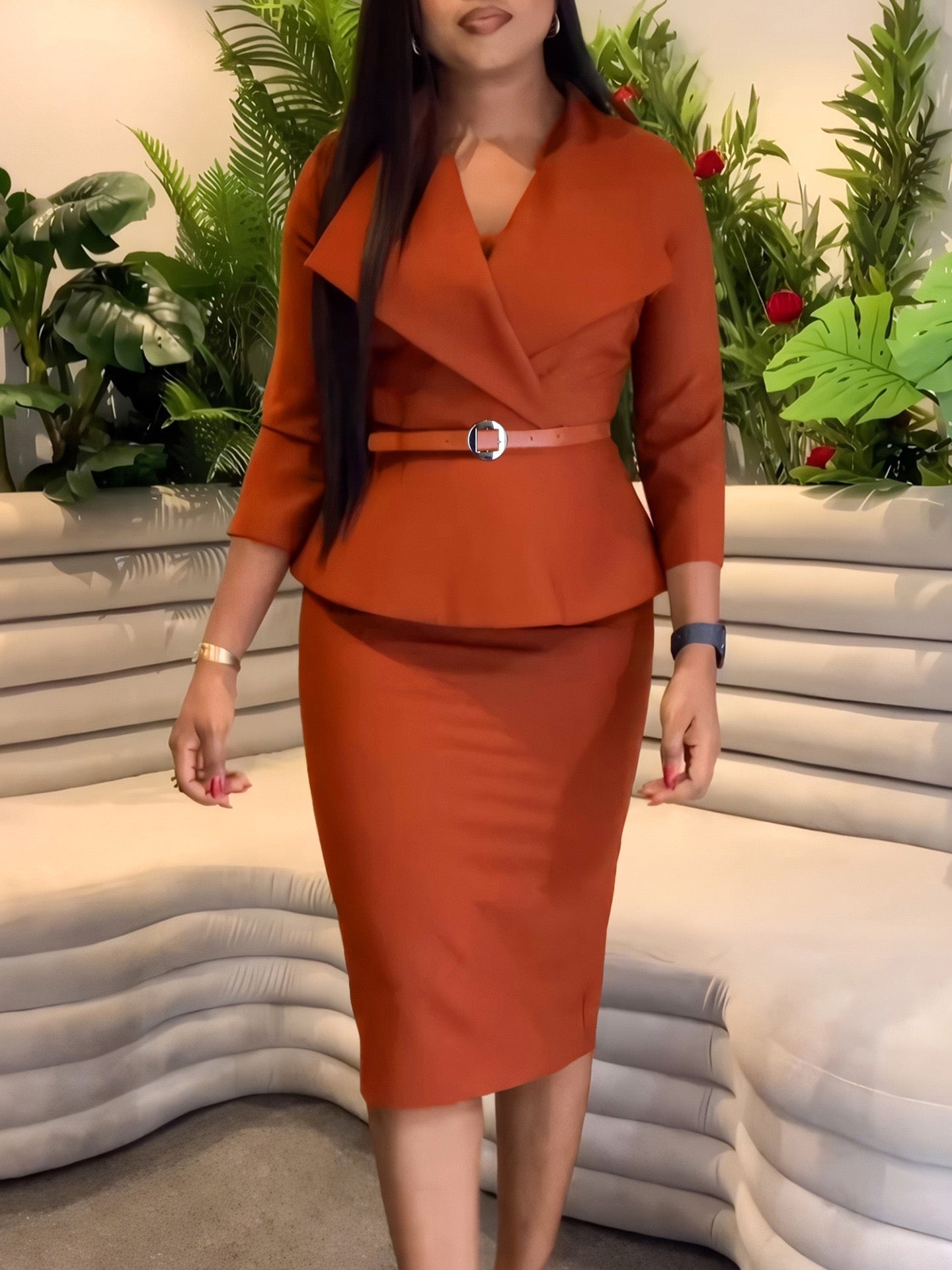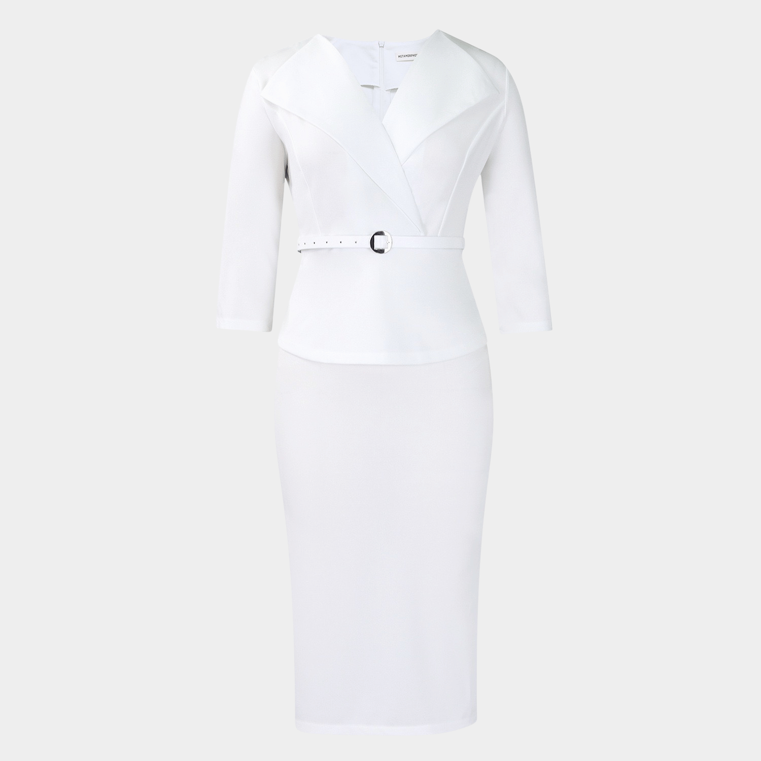 • Design: Tailored jacket with sculpted waist, structured lapel, body shaping midi skirt, clean architectural lines.