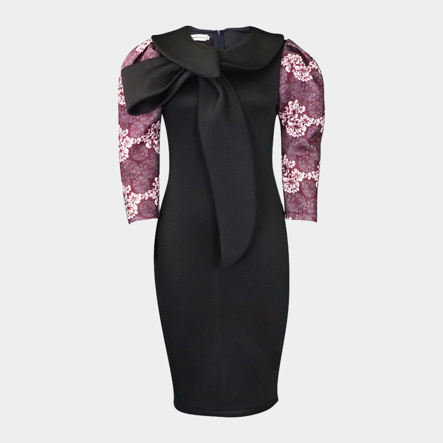 Structured Midi Dress with Front Bow Detail and Patterned Puff Sleeves
